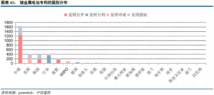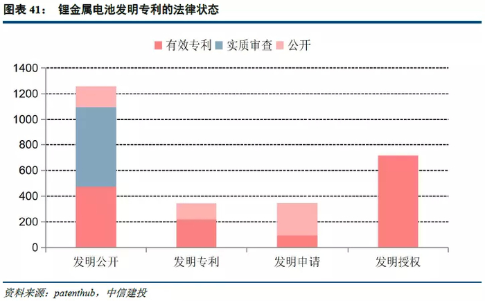 以lithium metal battery和 锂金属电池 为关键词进行检索,全球已有超过2000个锂金属电池相关的发明专利(统计或存在一定误差)。其中约一半属于有效专利,其余的大部分处于实质审查状态。也有少量的无效、失效专利(图中未列出)。