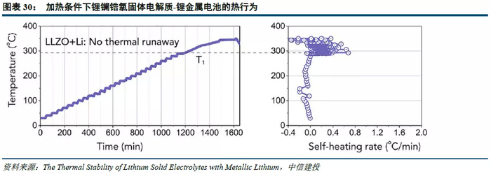 根据Hong Li等学者的研究结果,测试不同固体电解质和锂金属搭配组成电池的热行为,石榴石氧化物体系的锂镧锆氧可以保证电池在300度以内不发生热失控。