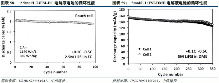 专利WO2017214276A1描述了以钴酸锂为正极,极薄锂金属(15微米,蒸镀在铜箔上)为负极,2mol/L LiFSI为锂盐的锂金属电池的性能。低倍率充放电条件下,2Ah、400Wh/kg、1200Wh/L电池的循环寿命超过100次;倍率提升后电池性能有退化。