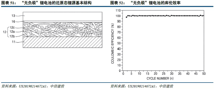 专利US20190214672A1描述了将锂金属粉末和LiFSI、DME、无纺布等复合,制成“无负极”锂电池的方法。该电池还搭配LATP固体电解质,在50次循环内保持了接近100%的库伦效率,也为锂金属电池体系的构建提供了新的思路。