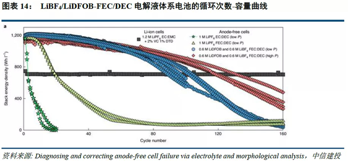 Dahn团队的研究成果Diagnosing and correcting anode-free cell failure via electrolyte and morphological analysis 2020年发表在Nature energy上。研究工作的正极材料为单晶NCM523(Dahn在他的多项工作中选择此正极),电解液使用的双锂盐为LiBF4和LiDFOB,溶剂为FEC和DEC,用量2.6g/Ah,或0.5ml/Ah;电池物理形态为230mAh小软包电池。