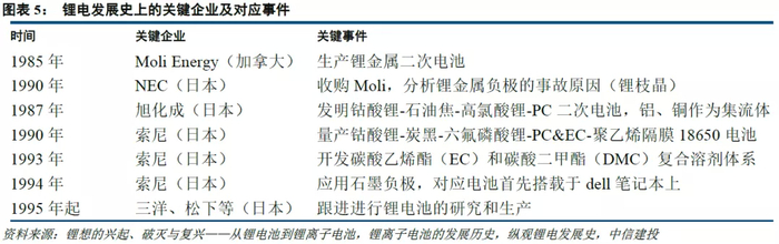 Moli Energy的锂电池具备超过100Wh/kg的比能量,首先应用于3C领域(掌上电脑、无绳电话)。从1985年推出产品,到1989年春天推出第二代产品,再到同期第一代产品出现起火爆炸的安全事故,Moli Energy在1990年春即为NEC收购。