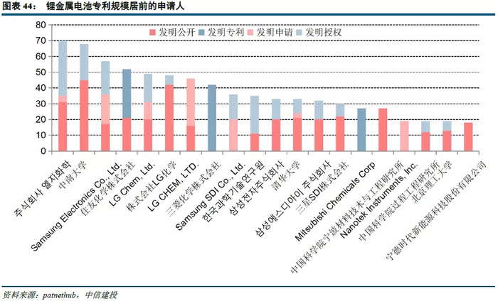 锂金属电池专利的主要申请人是LG化学、三星、住友、三菱等国际巨头。国内申请者中专利数量居前的机构是高校及科研院所:中南大学、清华大学、中科院等。宁德时代等国内电池企业有相关专利申请。电池初创企业,如SES(原Solidenergy)、Quantumscape、清陶等,也有少量锂金属电池专利。