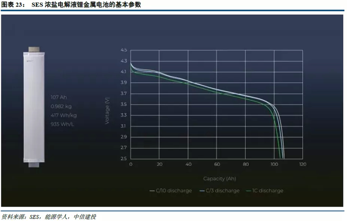 如SES(原Solidenergy)发布的105Ah电池样品,据称具有417Wh/kg质量能量密度、935Wh/L体积能量密度、在高至1C的放电倍率下保持了较高的容量-电压特性。