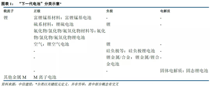 如本系列报告开篇《电池科技前瞻系列报告之一:巨匠扛鼎,后继不竭》所述,“下一代电池”概念宽泛且概念间有交叉,但回归本质,多立足某一种载流子,对相应的正负极、电解质等进行革新。详见下表。