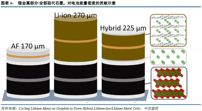 商业化的正极材料比容量更低(~150-200mAh/g)所以正极材料的容量提升对电池(单体)能量密度提升作用显著。而另一方面,负极的容量提升对于电池能量密度提升仍有相当程度作用。商业化的石墨负极容量在360mAh/g左右,已非常接近其理论比容量372mAh/g。与其相比,更高理论比容量的负极材料,如硅,从学术研究起步,逐步走入产业应用视野(相关研究可参见报告:负极硅碳,风语黎明)。而一切锂离子电池负极材料的终点,无疑是具有高达3860mAh/g的理论容量,和0V对锂电压的锂金属本身。正因为此,锂金属号称负极的“圣杯”。