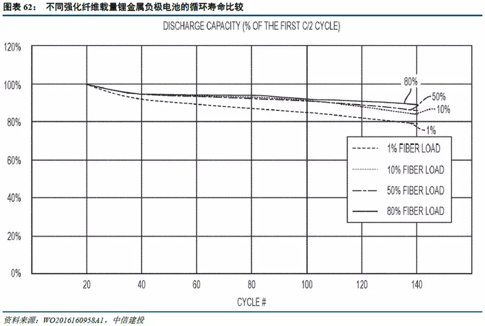 另外,SES也对锂金属负极表面涂覆改性改善循环寿命进行了探索。有关结果见于专利US10347904B、专利WO2016160958A1等。根据实施例,如使用聚合物及高载量强化纤维改性锂金属后,电池循环寿命可以有比较明显的提升。