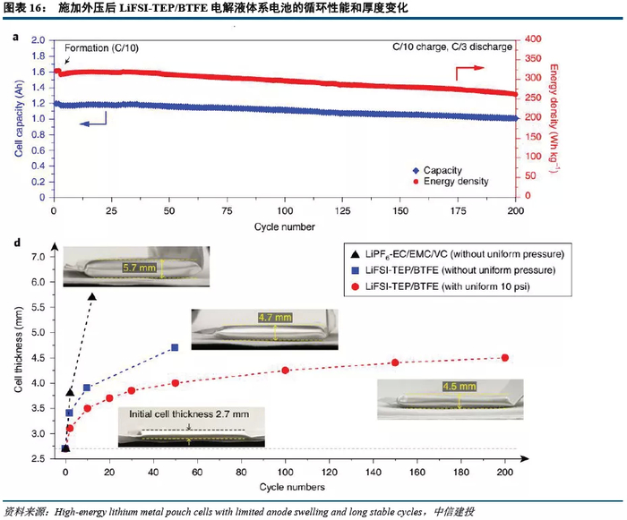 研究者认为,锂盐对锂负极的保护、加压对锂负极表面积和形态的正面作用共同促进了电池寿命的提升。