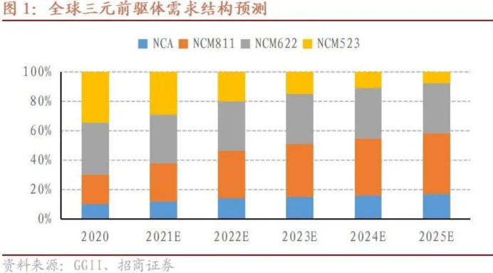 据招商证券在研报中表示,高镍化大势所趋,从全球范围来看,预计2025年8系以上三元前驱体全球需求占比为58%。2020年高镍(NCM811&NCA)三元前驱体市场份额约30%,预计2021-2025年高镍占比预计将分别达到38%/47%/51%/55%/58%,其中NCA市场份额从10%左右小幅提升至17%。