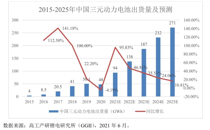 这一过程也造就了硫酸镍溢价维持高位。目前,硫酸镍供给持续偏紧,反映在价格上,硫酸镍溢价虽然自3月份高点有所回落,但仍居高位,超20000元/镍吨。招商证券预计,预计2025年电池级硫酸镍全球总需求为72万镍吨,2021年三元前驱体需求量预计为57万吨,2025年有望增至167万吨。