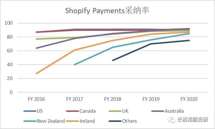如图表所示。支付服务从 2013 年开始分阶段在各主要市场推广,每个市场基本都能达到 90% 左右的采纳率(很好理解,交易费用在 2.5% 左右(看你会员级别)如果用第三方其他支付,除了第三方交易费大概率更贵之外,还要交给 Shopify 额外 0.5-2% 不等)。但是普遍需要 5 年时间才能达到这个采纳率。