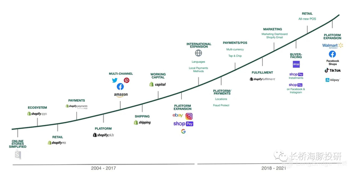 Shopify(SHOP.US)的名字来源是 Shop 商店的动词化,差不多就是 “把……变成商店” 的意思。这个朴实的命名代表了创始人的价值主张:让越来越多的人实现创业梦想,把创业(开店)理念付诸实践。古往今来(也就 20 余年)所有成功的电商公司都要么从第一天就是零售商(亚马逊,京东)要么就是无可避免的遇到了纯平台模式的成长瓶颈,部分变成了零售商(阿里和最近的拼多多)。