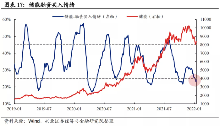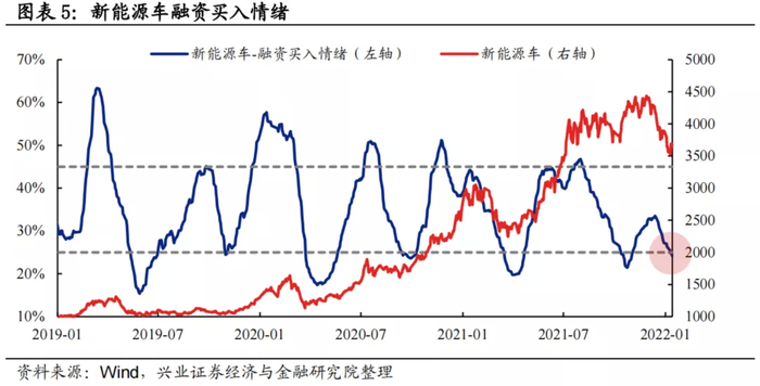 融资买入情绪:过去两年新能源车板块融资买入情绪波动区间基本为25%至45%,当前为24.2%,低于经验下限阈值。