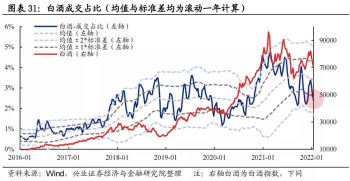 换手率:白酒换手率近期大幅回落,当前已接近于均值-1.5倍标准差经验下限阈值。