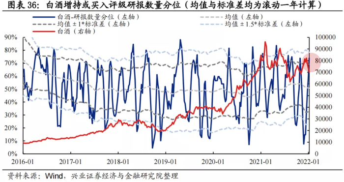 研报数量:分析师新发布的增持或买入评级的白酒公司研报数量分位当前为73.95%,位于均值+1倍标准差上方,随着板块调整,分析师看多情绪已在升温。