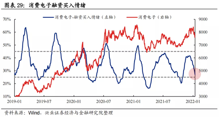 融资买入情绪:过去两年消费电子板块融资买入情绪波动区间基本为25%至45%,当前为27.12%,已基本接近经验下限阈值。