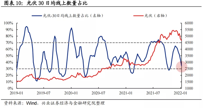 30日均线上数量占比:过去两年光伏板块30日均线上个股数量占比波动区间基本为30%至70%,当前为34.61%,接近于经验下限阈值。