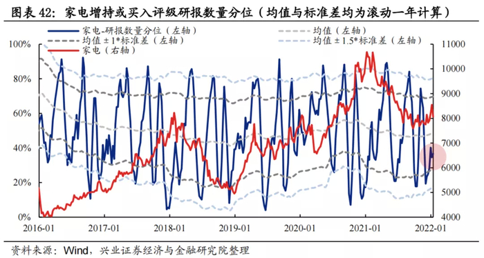 研报数量:分析师新发布的增持或买入评级的家电公司研报数量分位当前为36.7%,分析师看多情绪处于中等偏低水平。