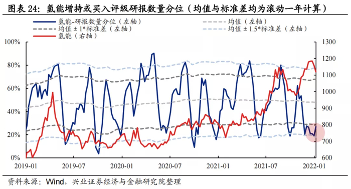 研报数量:分析师新发布的增持或买入评级的氢能公司研报数量分位当前为27%,处于较低水平。