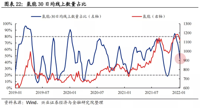 30日均线上数量占比:过去两年氢能板块30日均线上个股数量占比波动区间基本为20%至80%,当前为45.7%,处于中等水平。