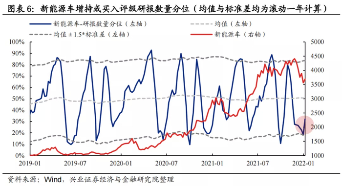研报数量:分析师新发布的增持或买入评级的新能源车公司研报数量分位当前为32.1%,自上周触及均值-1.5倍标准差经验下限阈值后开始有所回升。