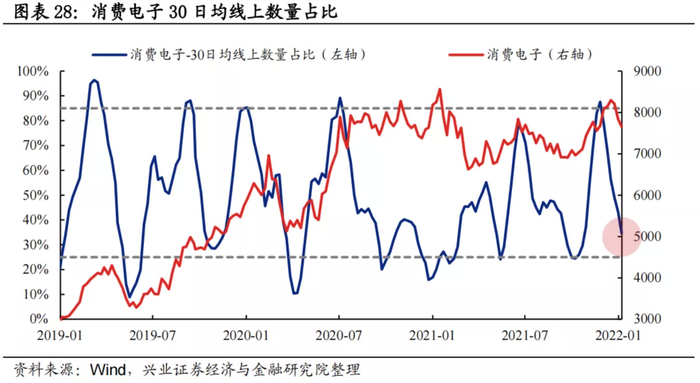 30日均线上数量占比:过去两年消费电子板块30日均线上个股数量占比波动区间基本为25%至85%,当前已回落至34.7%,整体处于较低水平。