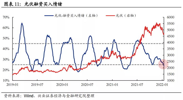 融资买入情绪:过去两年光伏板块融资买入情绪波动区间基本为25%至45%,当前为23.7%,已低于经验下限阈值。