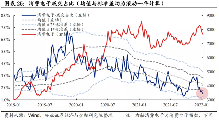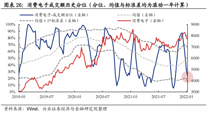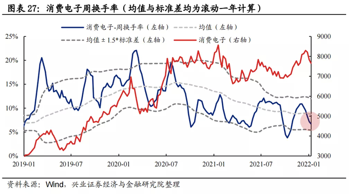 换手率:消费电子换手率自12月以来大幅回落,当前已位于均值下方。