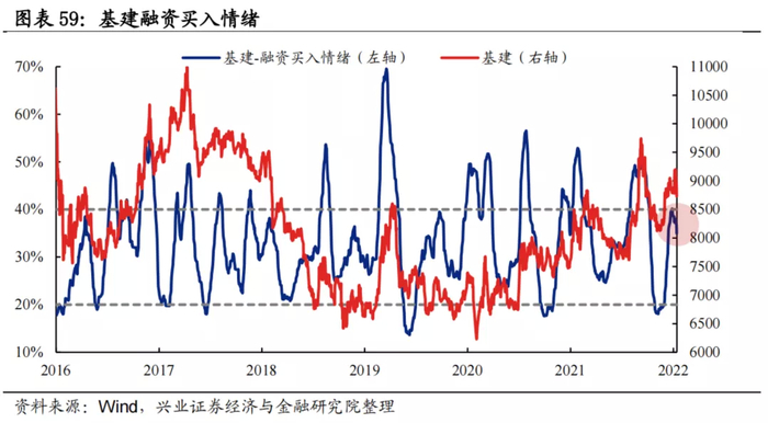 融资买入情绪:基建板块融资买入情绪波动区间基本为20%至40%,当前为34.9%,处于较高水平。
