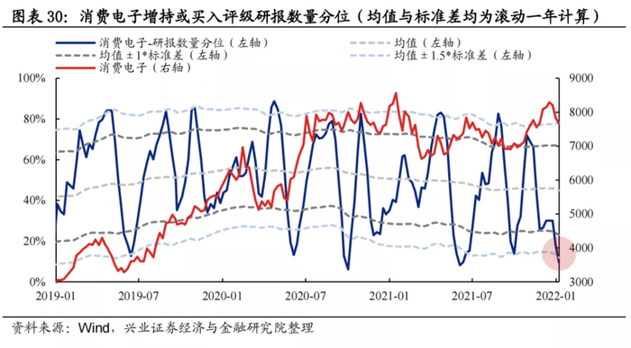 研报数量:分析师新发布的增持或买入评级的消费电子公司研报数量分位当前为9.68%,已低于均值-1.5倍标准差的经验下限阈值水平。