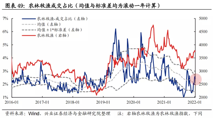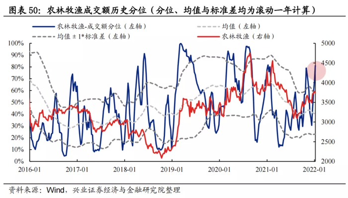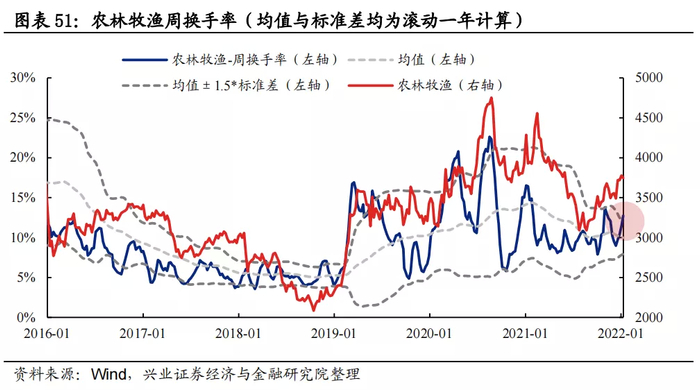 换手率:农林牧渔换手率当前处于均值+1.5倍标准差经验上限阈值上方。