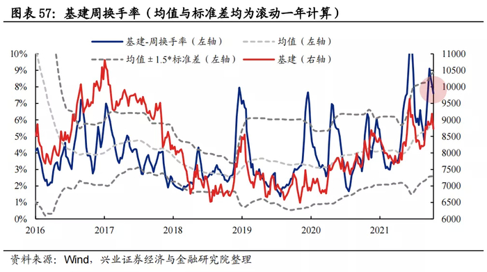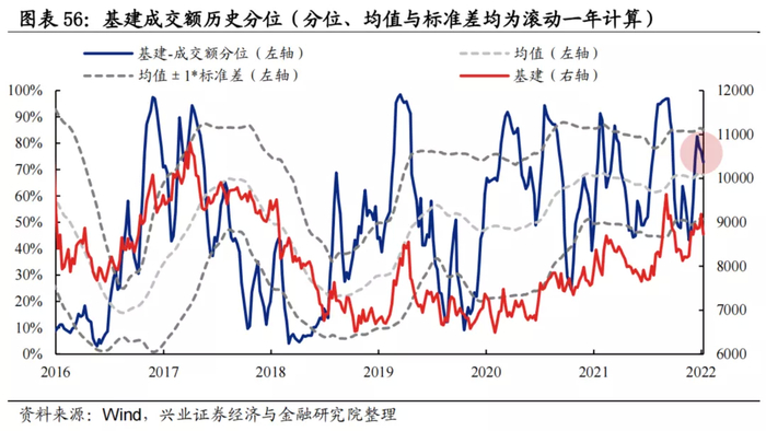 换手率:基建换手率在上周接近均值+1.5倍标准差经验上限阈值后本周有所回落,但整体仍处于均值上方。