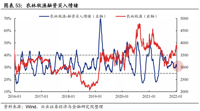 融资买入情绪:农林牧渔板块融资买入情绪波动区间基本为25%至40%,当前为30.6%,处于中等水平。