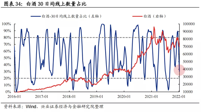 30日均线上数量占比:白酒板块30日均线上个股数量占比波动区间基本为20%至80%,当前已回落至30.3%,拥挤度处于较低水平。