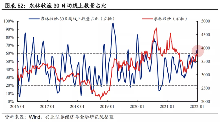 30日均线上数量占比:农林牧渔板块30日均线上个股数量占比波动区间基本为20%至60%,当前已升至64.7%,处于相对拥挤水平。