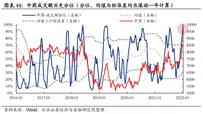 成交占比/成交额:中药板块成交占比和成交额分位基本在均值±1倍标准差范围波动,当前均已大幅超越均值+1倍标准差经验上限阈值。