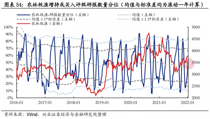 研报数量:分析师新发布的增持或买入评级的农林牧渔公司研报数量分位当前为53.53%,高于均值水平。