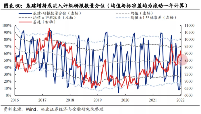 研报数量:分析师新发布的增持或买入评级的基建公司研报数量分位当前为54.03%,处于均值中等偏高水平。