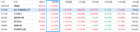 截至收盘,金沙中国(01928)大幅上涨近15%,美高梅中国(02282)涨近12%,永利澳门(01128)亦涨近13%。银河娱乐、新濠国际发展、澳博控股亦跟涨,板块涨幅高达10%,总体市值回升近430亿港元。一键解锁港股交易权限,点此3分钟免费开户>>