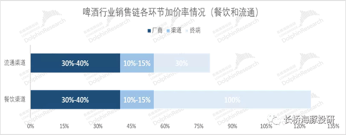 长桥海豚君产业链价值拆解,终端高利润:餐饮终端高依赖,决定终端在产业链中获得高利润,获得一半以上的利润。由于啤酒现饮(餐饮、KTV、夜场等)渠道的终端抢占成为各家啤酒生产商竞争的战线前沿,生产商、渠道和终端的议价权在餐饮渠道基本由终端主导,除去生产商和经销商支付的锁店等费用外,终端可获得产业链一半以上的利润。