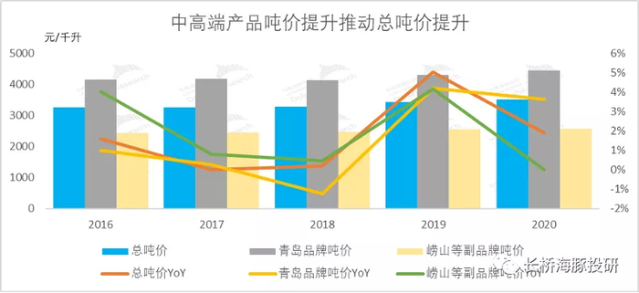 2020年青岛品牌吨价4,446元/千升,超过嘉士伯亚太吨价4,291元/千升,向百威亚太吨价4,457元/千升靠拢。主品牌在中高端市场的出色表现,带动公司整体啤酒吨价从2016年的3,260元/吨增长至2020年的3,496元/千升,CAGR为1.9%。