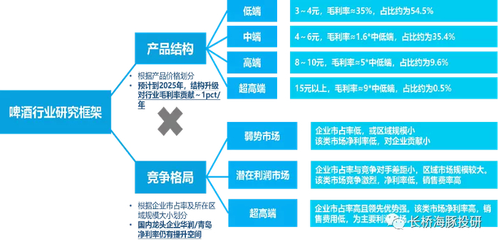 根据国内啤酒行业自身特性,长桥海豚君对当前啤酒行业发展阶段的分析框架做了梳理,我们认为啤酒行业利润率提升为未来主要看点,而驱动啤酒企业利润率提升的两个关键维度是竞争格局改善和产品结构升级。