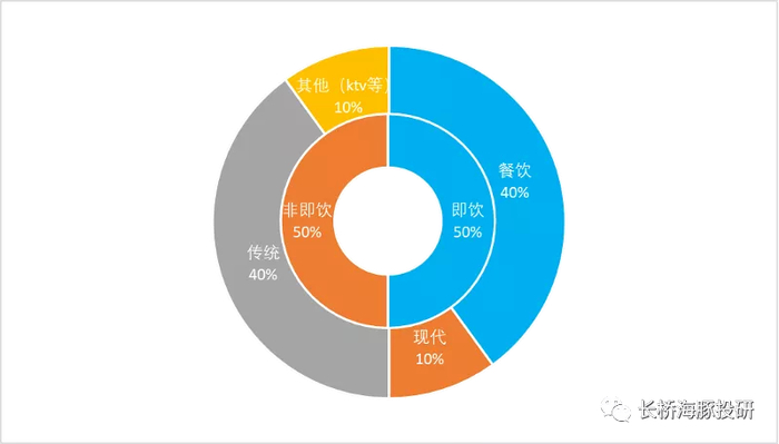 啤酒行业由于同时涉及到现饮(餐饮和娱乐等)和非现饮(流通现代和传统渠道等)多个渠道,渠道和终端依赖程度较高,其销售渠道体系在食品饮料乃至整体快消品行业都可谓最为复杂。长桥海豚君结合各家啤酒企业主要产商渠道结构进行了分析,发现啤酒行业销售餐饮渠道占比达到约40%,娱乐等其他现饮渠道占比约10%,现饮渠道总计占比约50%,流通渠道占比剩下的50%,其中KA渠道占比约10%,传统渠道占比达约40%。