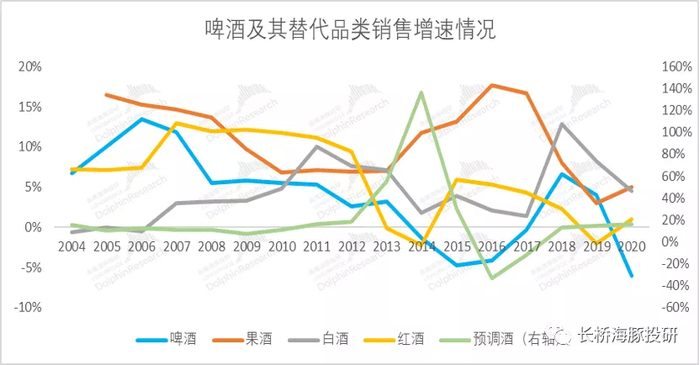 13年之后数年啤酒消费增速低迷,受替代性饮品推陈出新、预调鸡尾酒的兴起以及酒精替代饮料的创新不断加速,对年轻消费者的啤酒消费逐步分流。