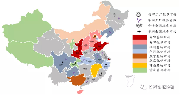 青岛啤酒在山东、陕西和安徽等市场市占率均达到60%以上,作为其利润池市场,华润啤酒在四川、辽宁和安徽等市场,百威在福建和黑龙江,燕京在北京、内蒙和广西,嘉士伯在新疆、宁夏、重庆、云南同是如此。