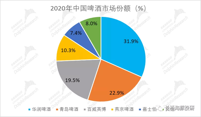 根据中国酒业协会数据,截至 2020年底中国啤酒行业CR5已突破至92%,行业高度集中,但是距离日本啤酒市场98%的CR4仍有一定上升空间,且与日本市场本土企业独大的情况不同,外资企业在中国啤酒市场占据了约30%的市场份额,百威等外资企业在中国高端啤酒市场地位强势。