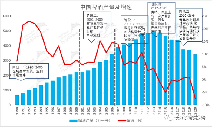 具体来看:阶段一(1990-2000),啤酒整体行业规模小,企业间竞争并不激烈,企业搭乘行业红利快速增长,阶段二(2001-2006),以华润雪花为代表进入跑马圈地期,以收购兼并啤酒厂为主要模式,阶段三(2007-2011),外延扩张有所放缓,行业注重效率,阶段四(2012-2015)二次跑马圈地,啤酒产量见顶,产能步入过剩情况,阶段五(2016-至今),国内啤酒行业进入结构升级期,产能优化、产品高端化进程加速。