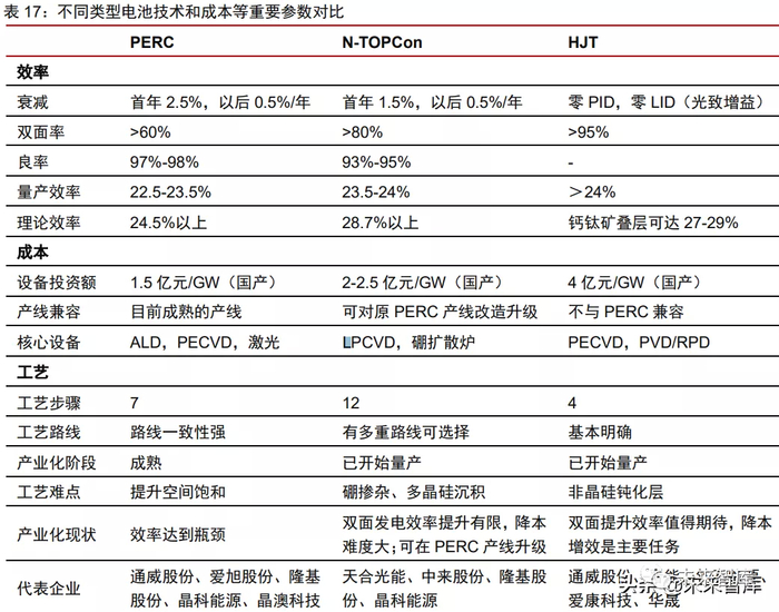 针对 PERC、TOPCon 和 HJT 这几种主流的技术路线,我们从效率、成本及工艺等 多个角度对比: