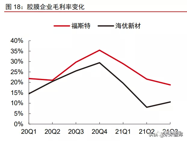 EVA 树脂供不应求或致胶膜厂商开工率和盈利分化,龙头企业优势巩固。EVA 胶膜 成本结构中,EVA 树脂占比一般近 9 成。以福斯特为代表的胶膜头部企业在供应链端采取 战略合作+市场化采购的方式,与国内外大型石化企业建立长期稳定的合作关系,具备更 强的供应链安全保障能力,保障 1-2 个月安全库存;且凭借龙头地位和商务谈判优势,在 原辅材料采购上往往能享有一定折扣,获得成本端相对优势。我们研判凭借供应链管控和 采购成本优势,龙头厂商与二三线企业实际开工率或将持续分化,份额和盈利优势进一步 巩固。