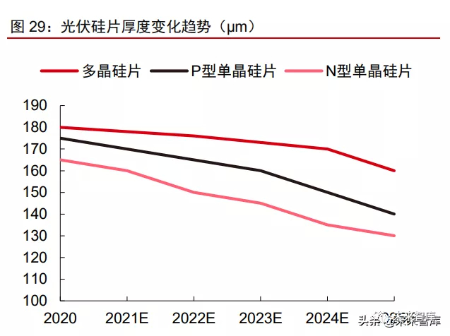 薄片化降本优势明显,发展有望提速。根据中环股份测算,硅片每减薄 10um,成本 原材料对应下降 2.5%,薄片化对于降本意义重要。目前 P/N 型单晶硅片主流厚度分别为 170μm 和 160μm,CPIA 预计到 2025 年将分别减薄至 140μm 和 130μm。